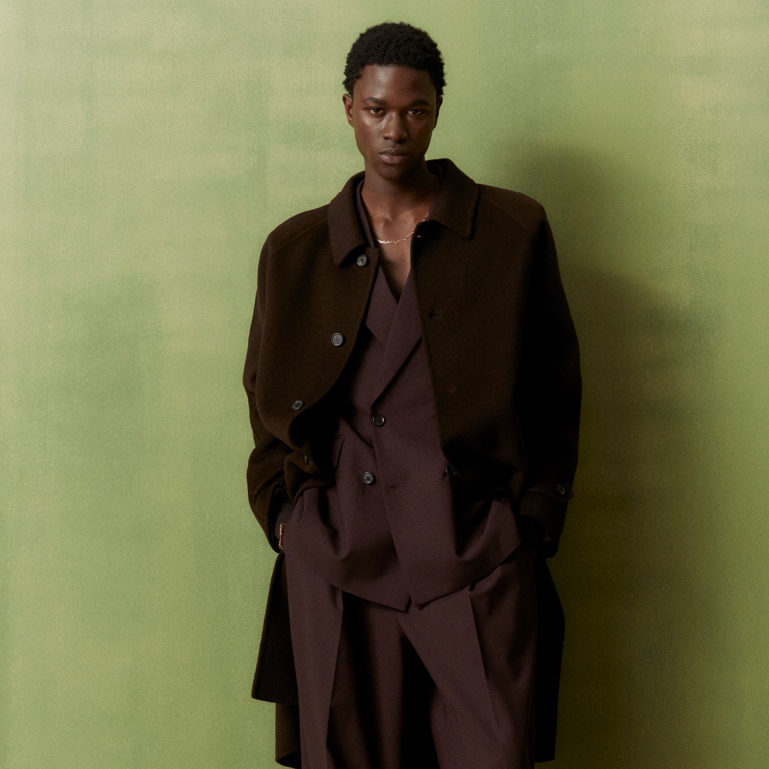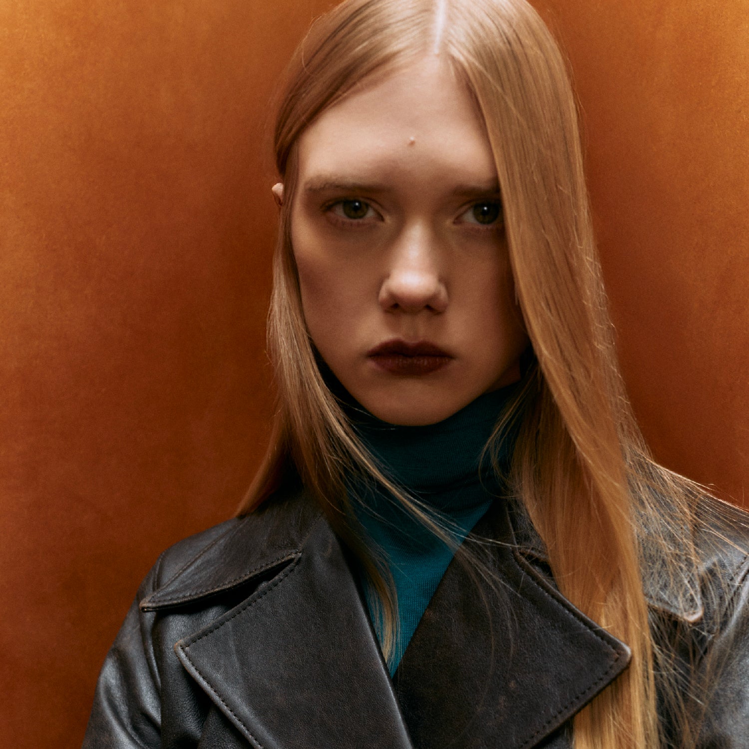 Finezza 16, collo alto, dettaglio apertura posteriore con bottone, maniche lunghe, fondo asimmetrico